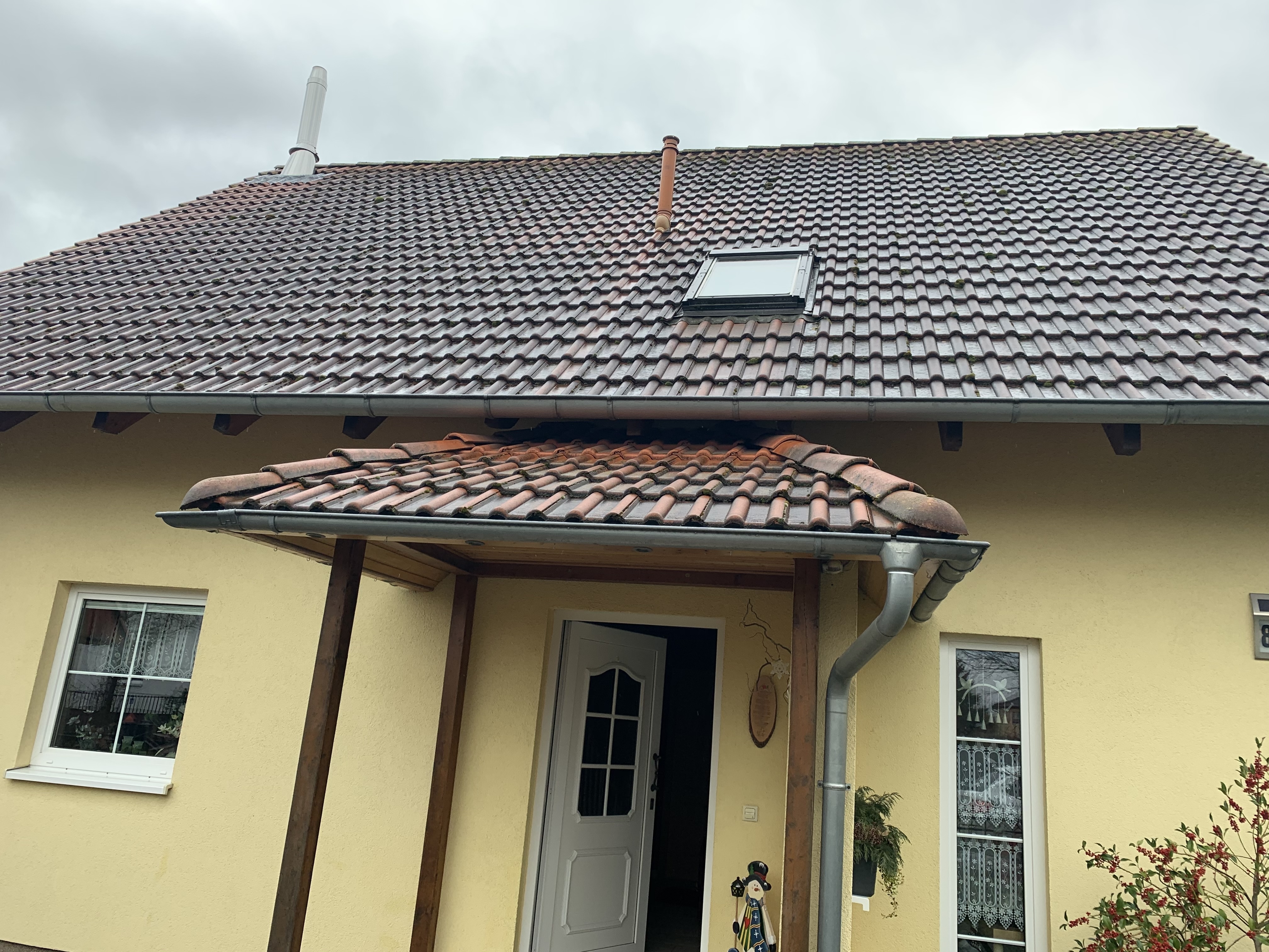 Gründliche Hochdruckreinigung von Dach und Fassade zur Entfernung von Schmutz, Moos und Algen.